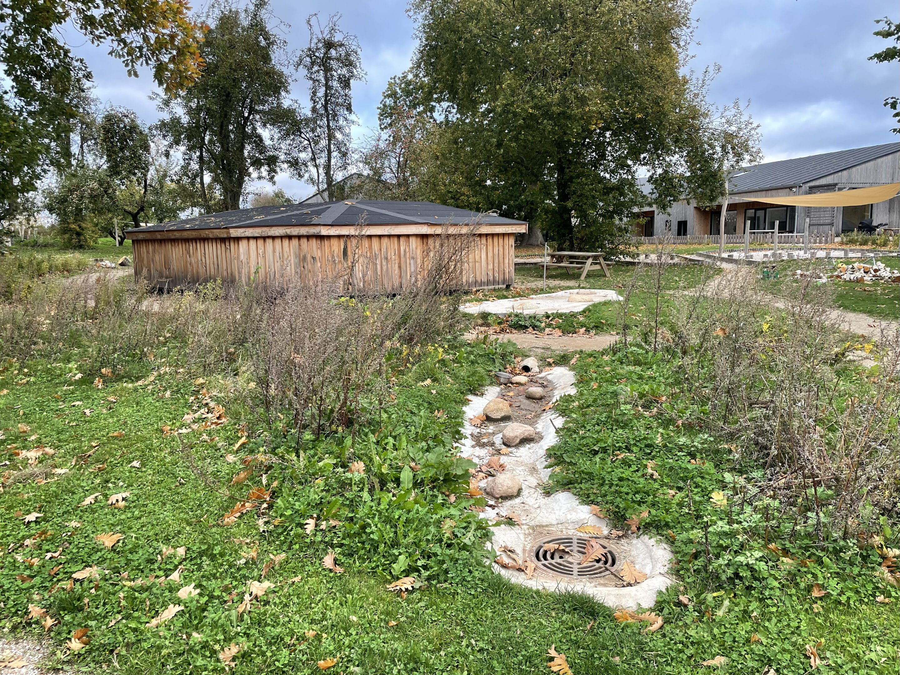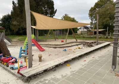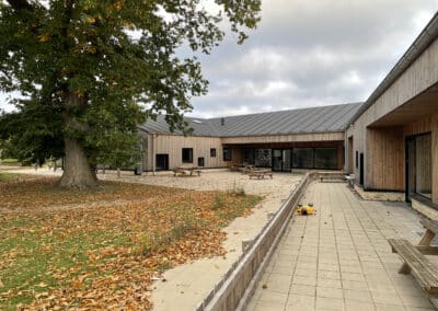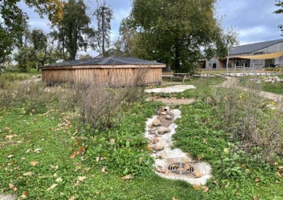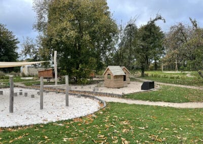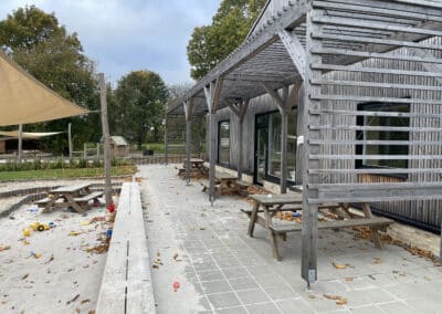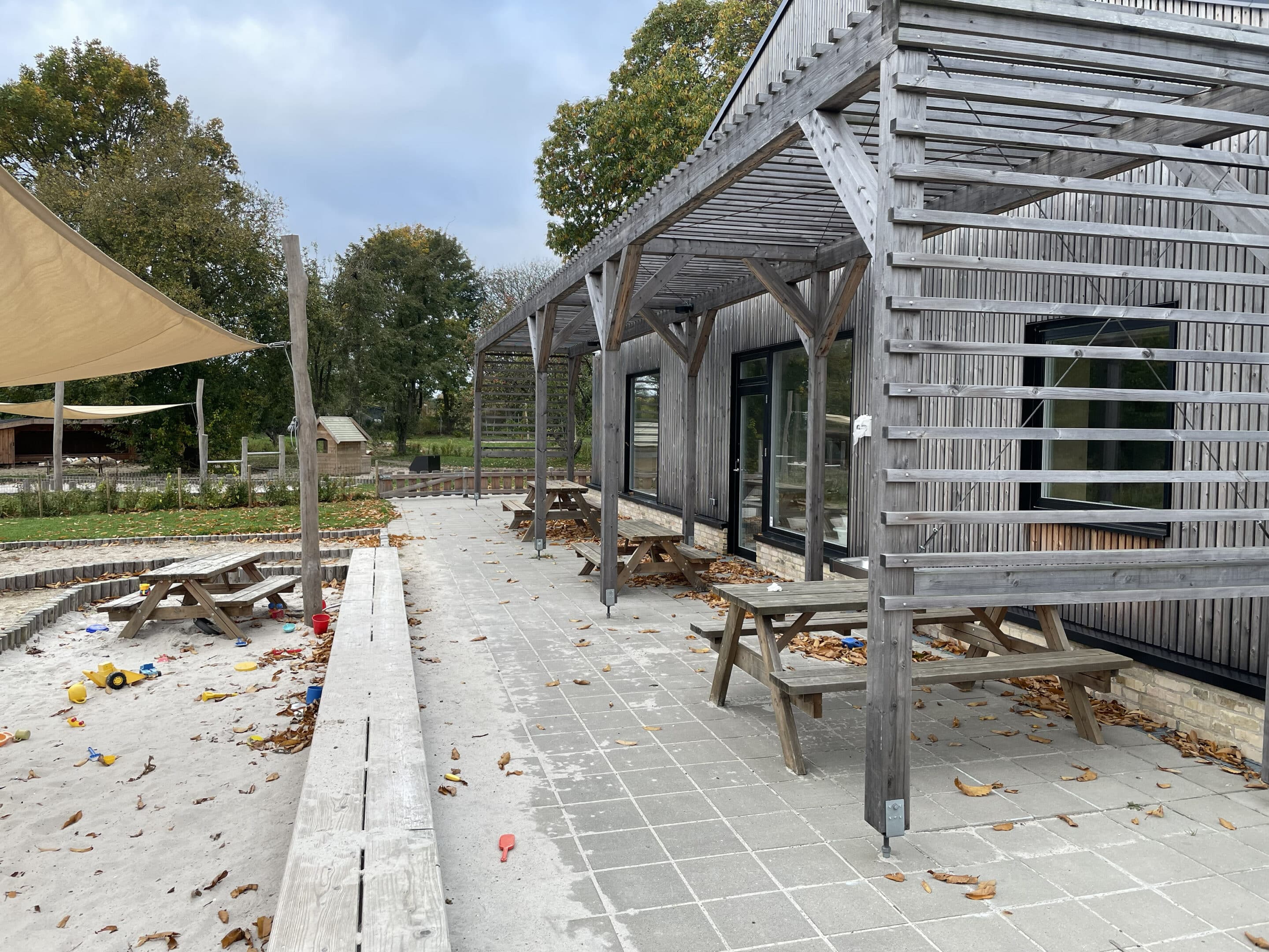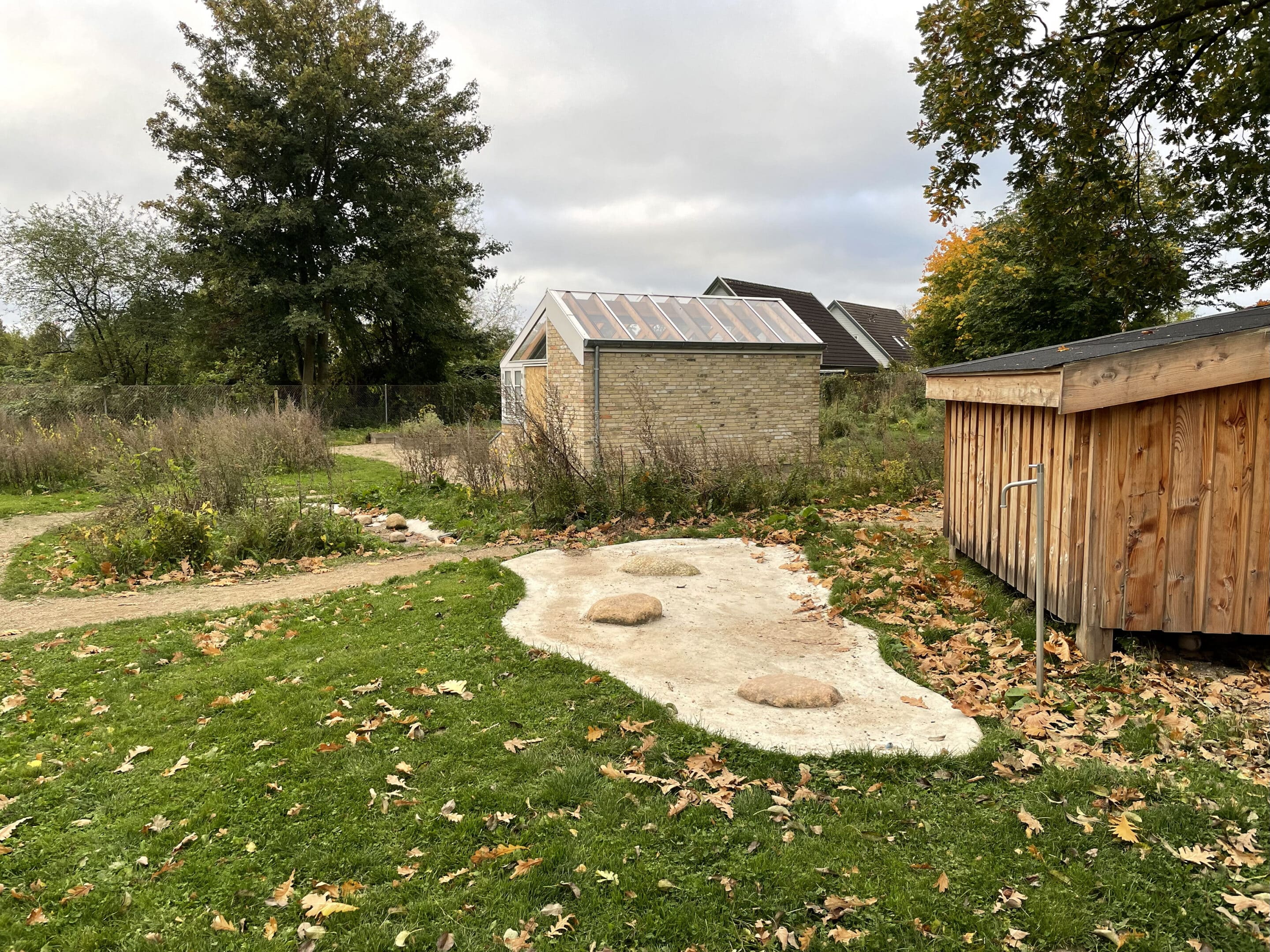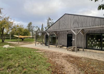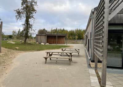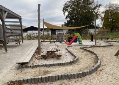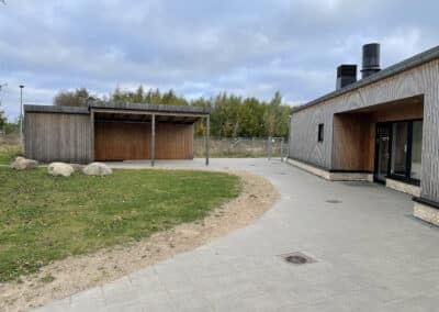 belægningsarealer. Da der var udfordringer med at skaffe betonelementer til byggeriet, blev løsningen, at vi in situ-støbte hovedparten af betonvæggene op i 4-5 meters højde. Disse vægge er synlige inde i bygningen den dag i dag og er med til at give interiøret et flot og rustikt look sammen med de øvrige vægge i træ. Endelig udførte vi al belægning på parkeringsarealerne, herunder græsarmering, og lagde fliser omkring hele bygningen, så børnene har let adgang til fine legeområder lige uden for huset. I terrænet stod vi for beplantning i form af buske og træer samt legeområder med bl.a. shelter, bålplads, legehus, rutsjebane og orangeri. Endelig etablerede vi et stisystem på grunden, så børnene kan gå på opdagelse.