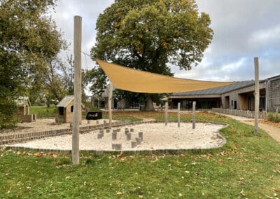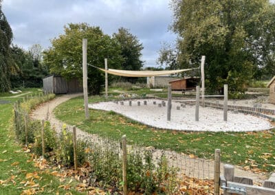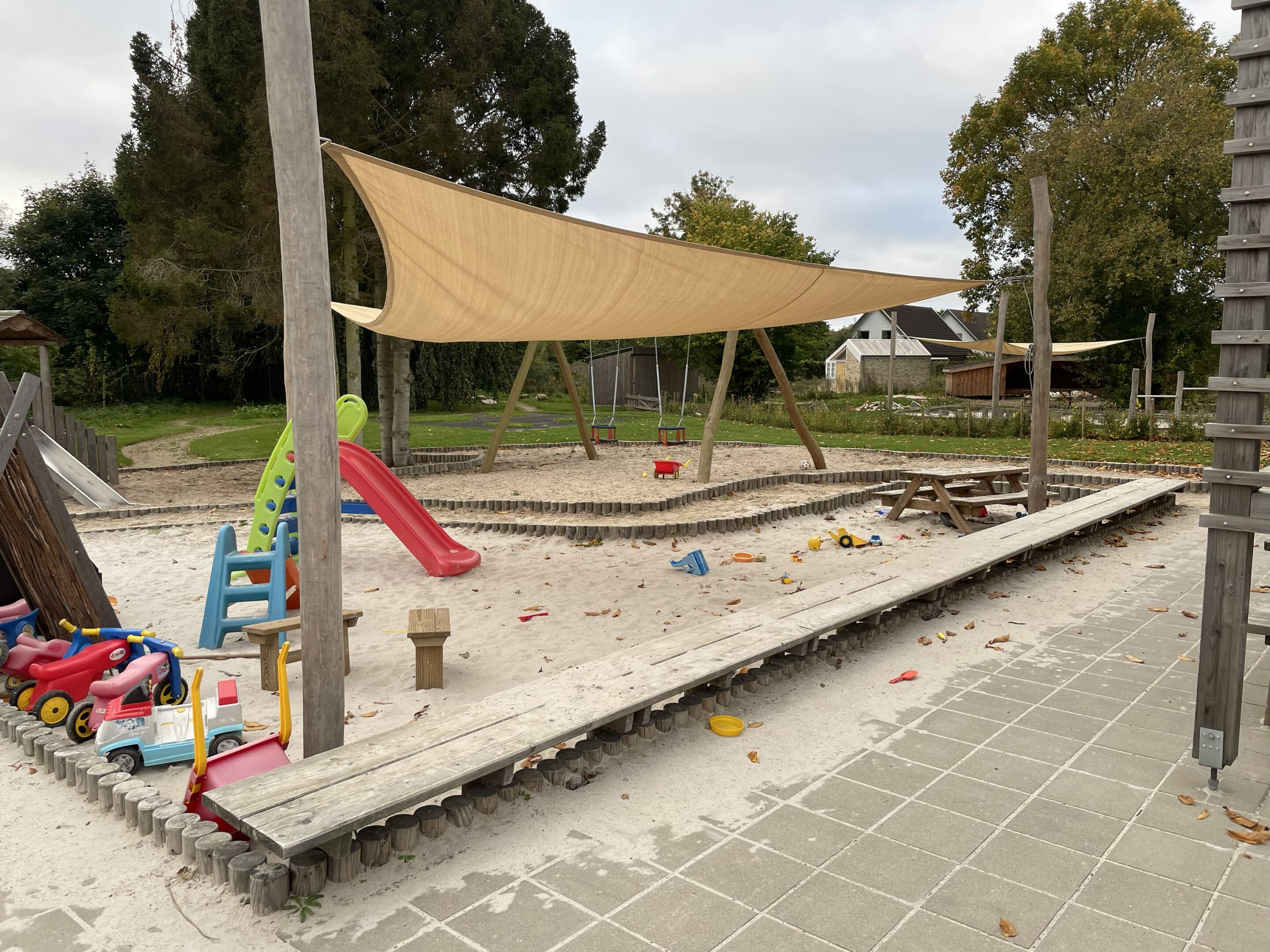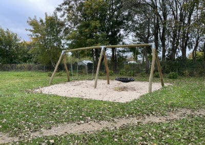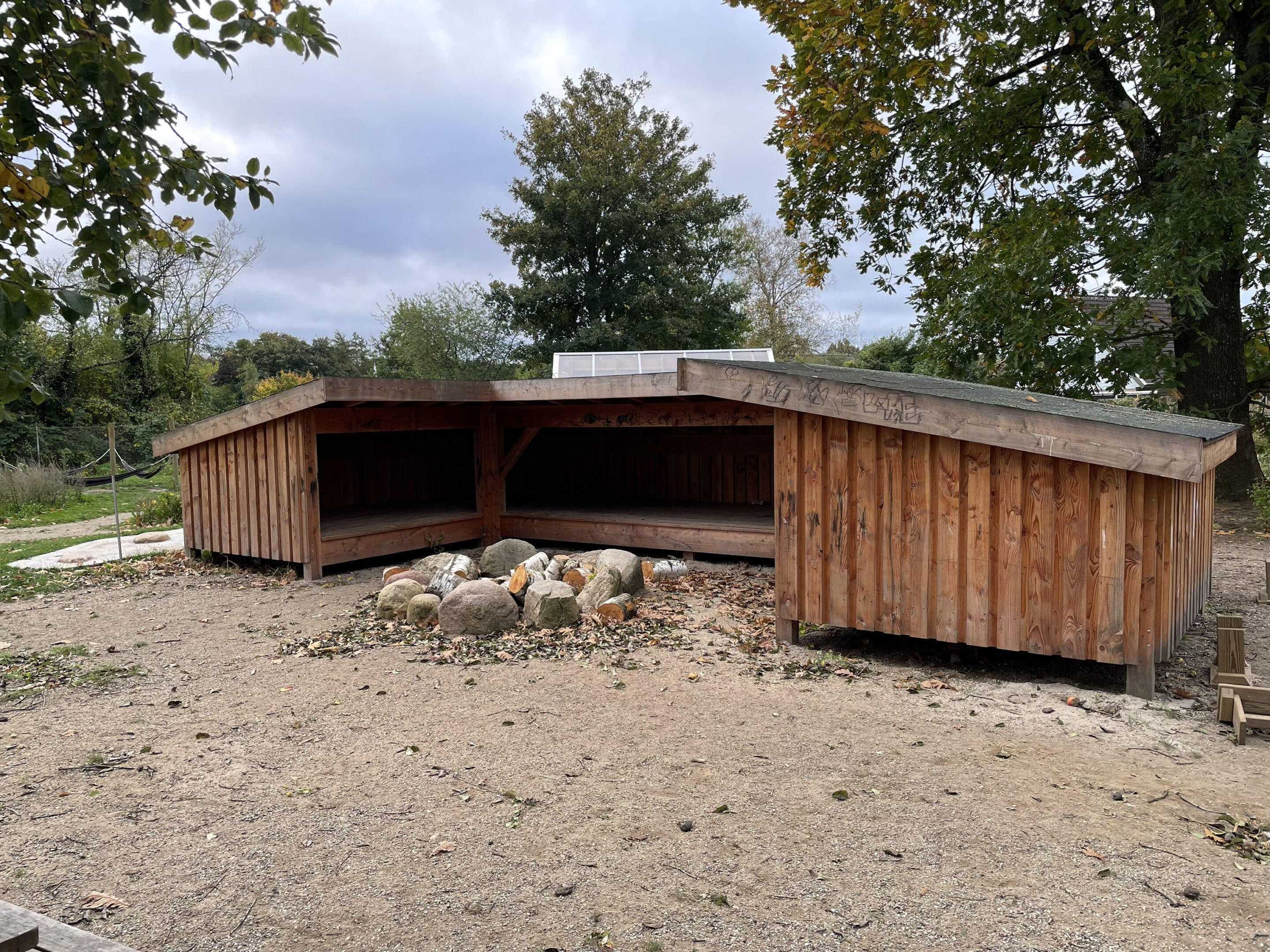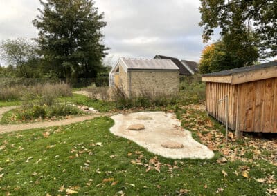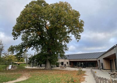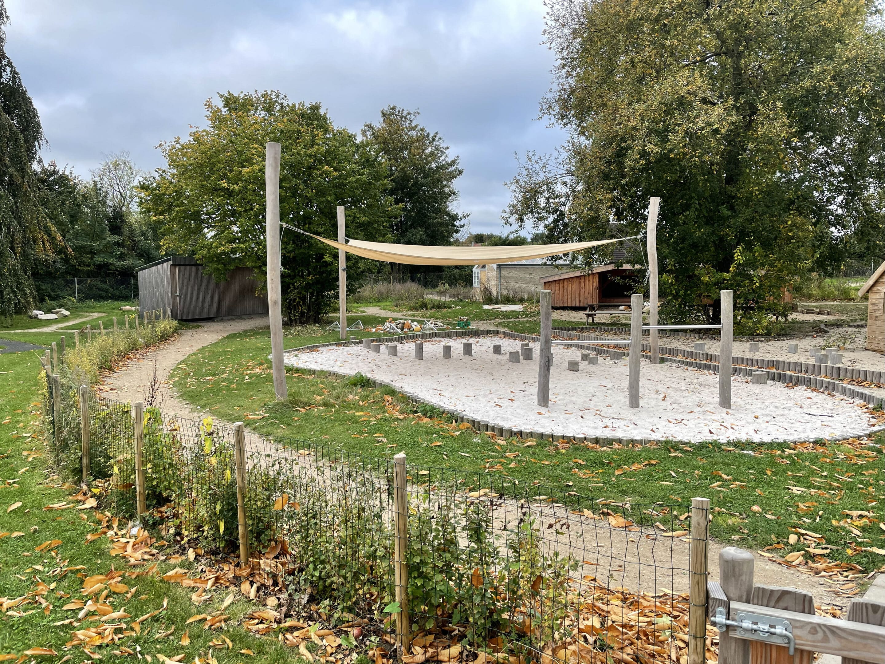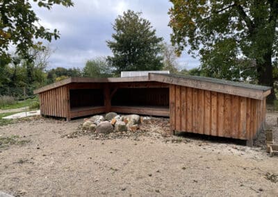 belægningsarealer. Da der var udfordringer med at skaffe betonelementer til byggeriet, blev løsningen, at vi in situ-støbte hovedparten af betonvæggene op i 4-5 meters højde. Disse vægge er synlige inde i bygningen den dag i dag og er med til at give interiøret et flot og rustikt look sammen med de øvrige vægge i træ. Endelig udførte vi al belægning på parkeringsarealerne, herunder græsarmering, og lagde fliser omkring hele bygningen, så børnene har let adgang til fine legeområder lige uden for huset. I terrænet stod vi for beplantning i form af buske og træer samt legeområder med bl.a. shelter, bålplads, legehus, rutsjebane og orangeri. Endelig etablerede vi et stisystem på grunden, så børnene kan gå på opdagelse.