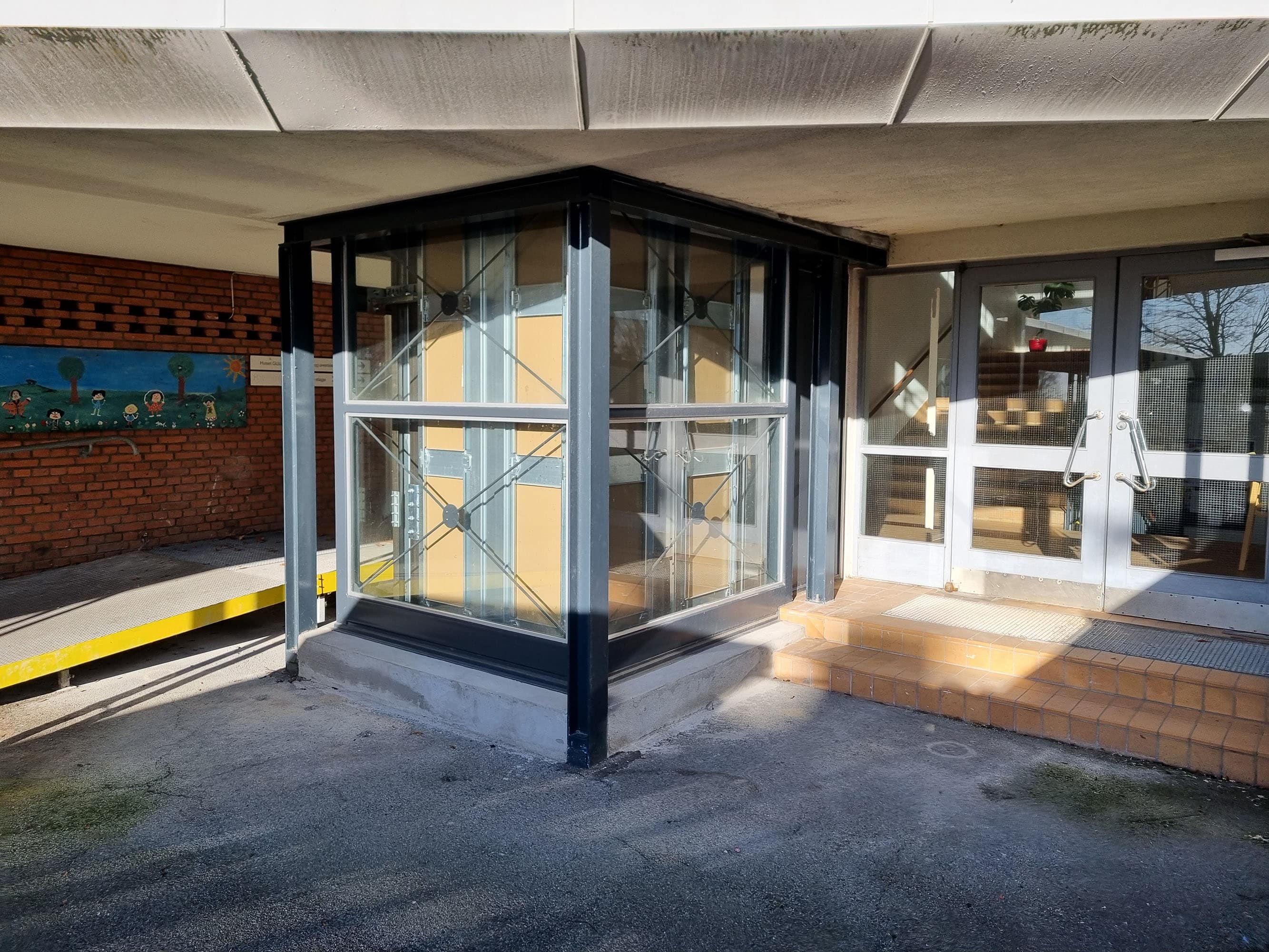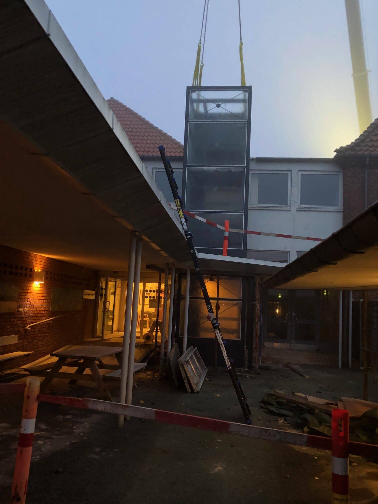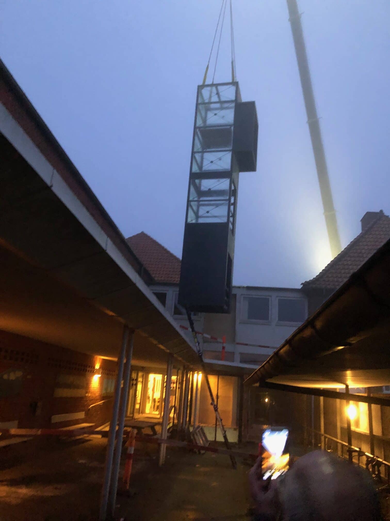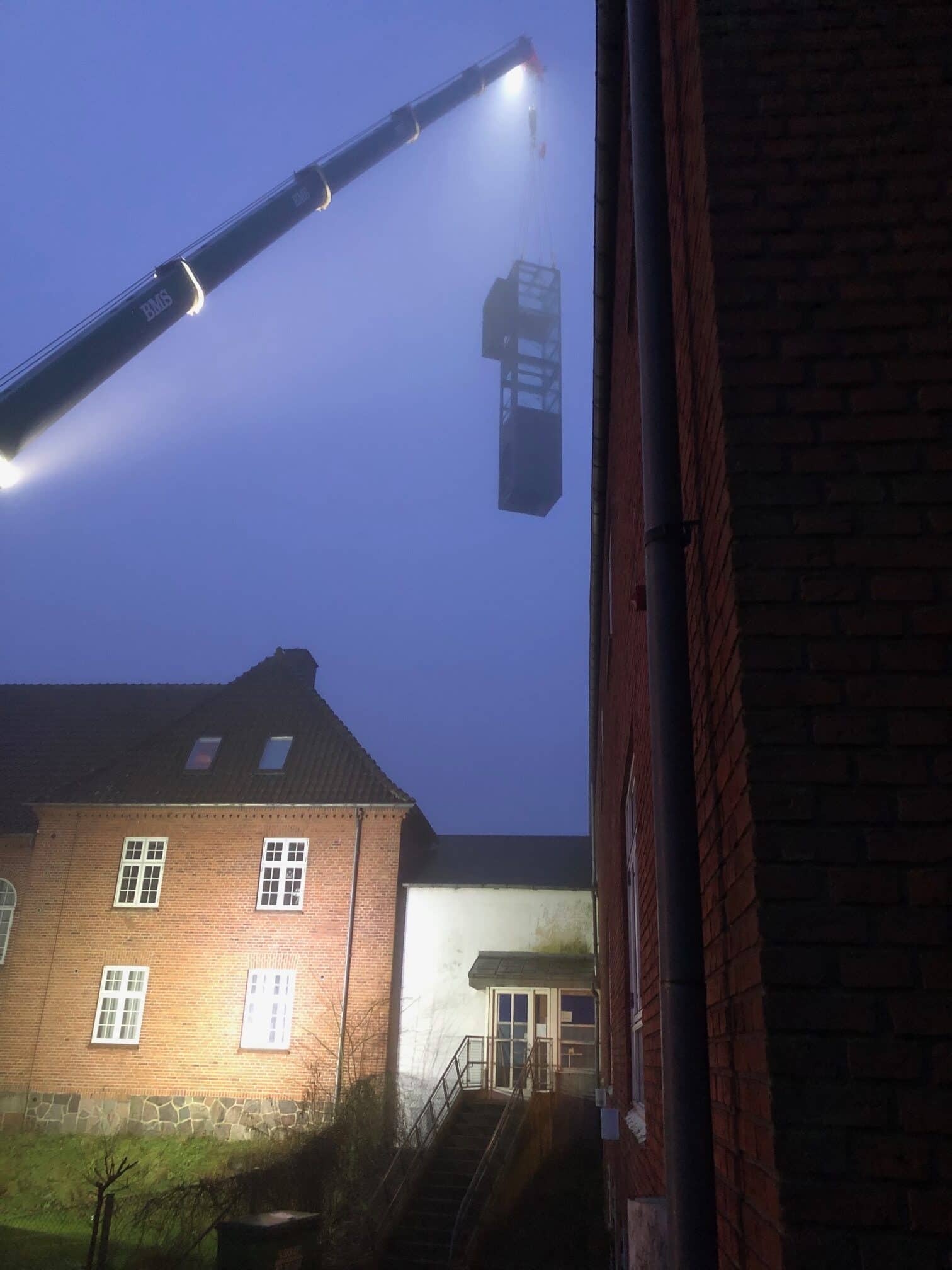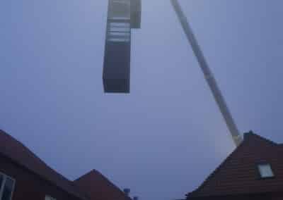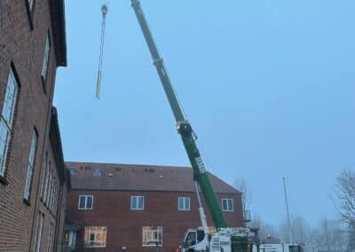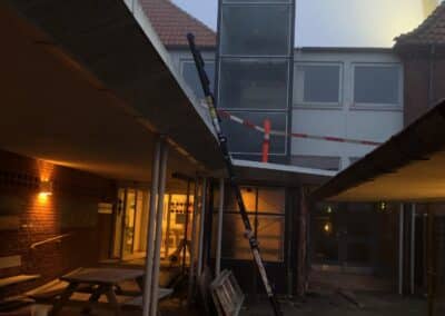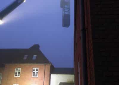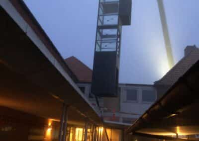Da skaktens fundament og konstruktion i kælderniveau var på plads, kunne vi påbegynde arbejdet med at stabilisere de næste etager og skabe plads op igennem bygningen. Her in situ-støbte vi nyt betongulv og nye betonvægge med indvendige stålkonstruktioner. Endelig kunne det præfabrikerede elevatortårn i stål og glas hejses ind med kran og blive monteret i den nye skakt. Alt passede, og kunden er i dag rigtig glad for den nye elevator, som flittigt anvendes hver eneste dag af de borgere, der har deres gang i huset.